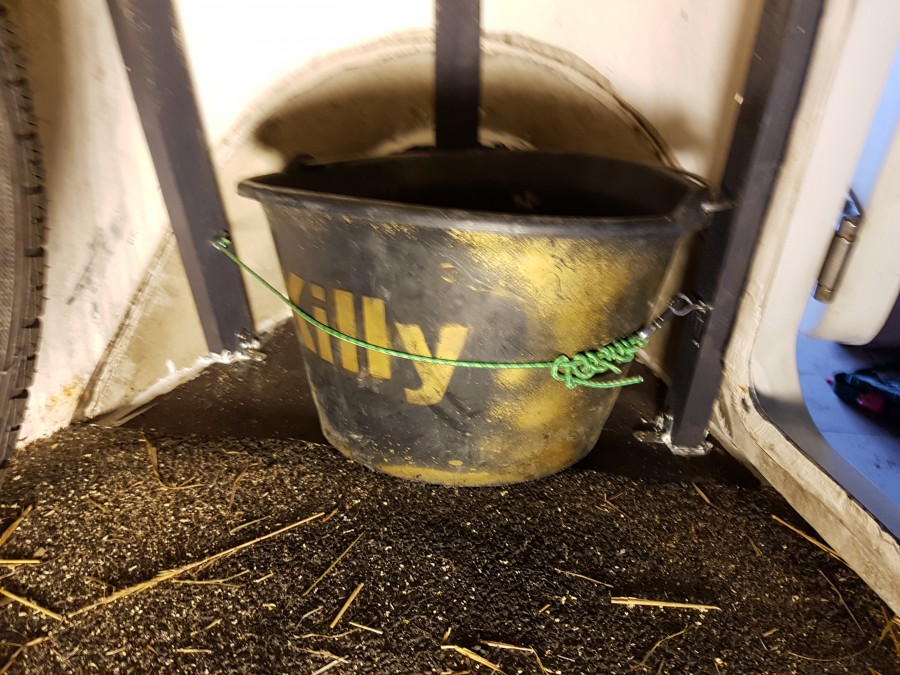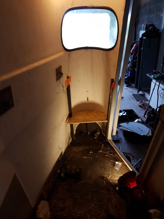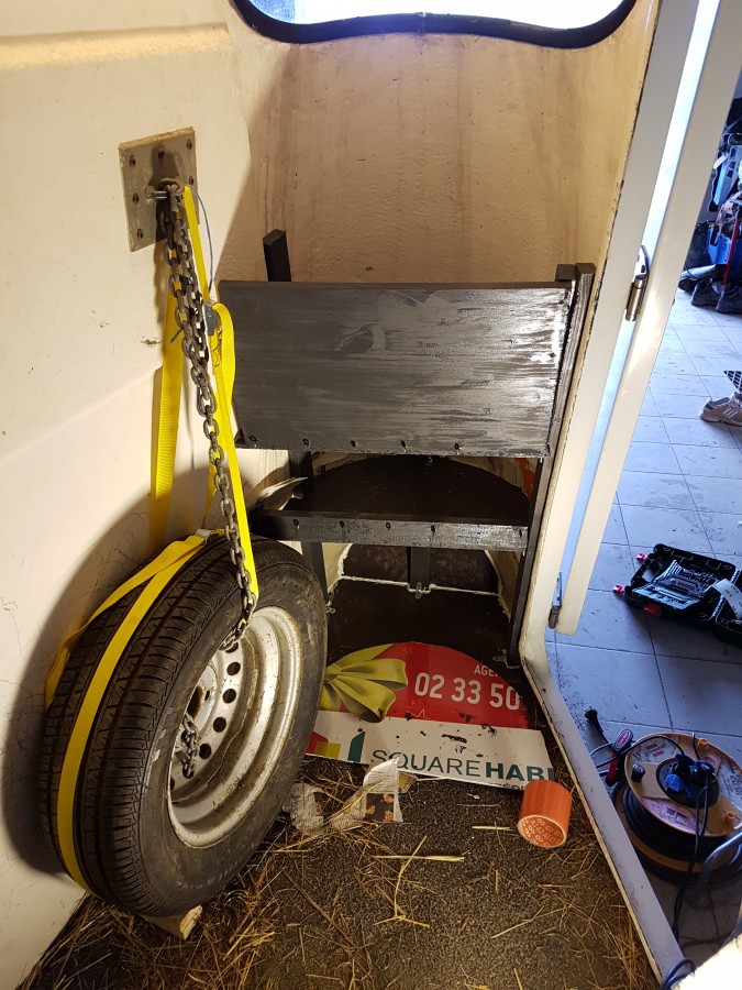 Ensuite j'ai démonté (avec de l'aide) une petite planche inclinée à l'avant qui était légèrement abîmée vers l'avant et je l'ai remplacer par une 2 planches dont une horizontal pour gagner de l'espace. Avec l'espace gagner j'ai pu créer une mini sellerie pour mettre un sceau, des brosses, un licol et une couverture. Quelques photos des différentes étapes :