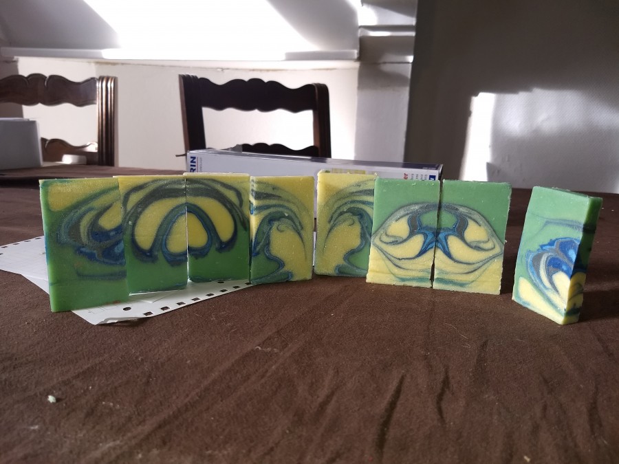 Je suis un peu déçue car la soude a foncé les couleurs. En plus mon moule accroche (on dirait qu'il est devenu poreux), du coup les bords ne sont pas lisses et réguliers.