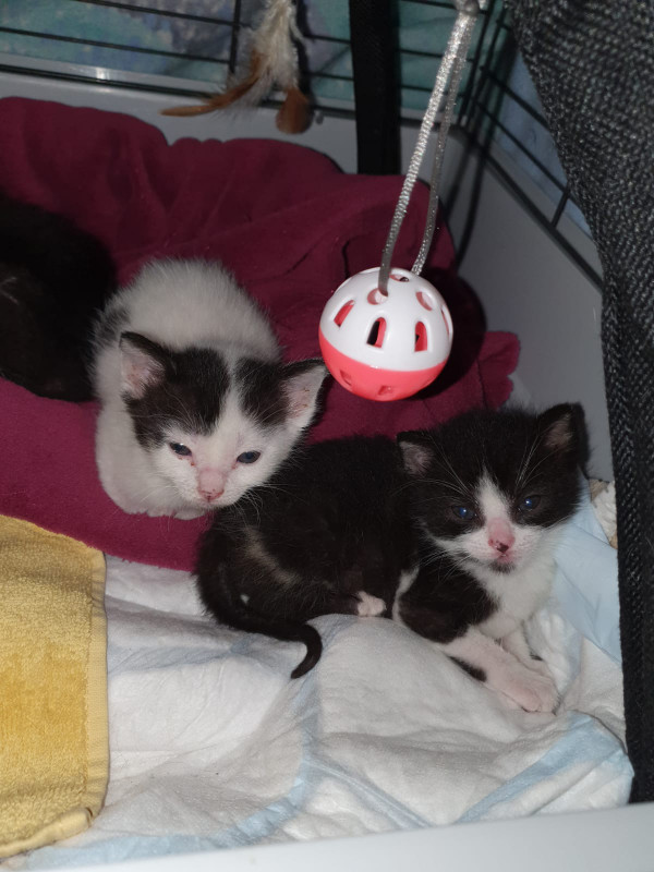 Ici, ça pousse aussi ! Ils mangent bien ... Le mâle commence à faire suer ses soeurs, c'est un sacré luron, toujours à se tortiller, à se pâmer sur le dos, à s'étirer comme un pacha Les deux femelles sont plus calmes, même si Minicrotte se débrouille bien ! C'est plutôt sa grande soeur que je trouve pas top top, mais elle mange, urine, défèque, marche, miaule ... et prend du poids. Elle est juste "moins en forme" quoi ...