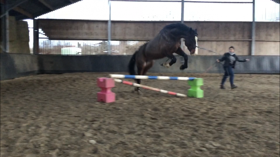 Ensuite enchainement de passages sur barre au sol / mini croix / petit vertical avec abord au trot et au galop. Il bouge vraiment bien, les transitions au galop sont sympas, et aussi IL REUSSIT A SAUTER AU TROT ! Amazing. D'habitude il est en galère, ne sait pas quoi faire de ses pattounes : là il prend le temps et il y a un vrai geste de saut.
