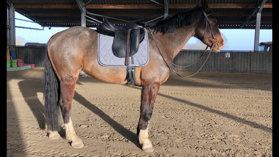 Je longe avec les bracelets, Daim fait quelques sauts de mouton (repos hier, folie dans le corps !) mais tout à fait sage, belle locomotion. Ensuite paye la galère pour réussir à le sangler maintenant qu'il a l'amortisseur mouton (+1 cale) sous la Sommer, alors que la 125cm était un peu serrée de base.