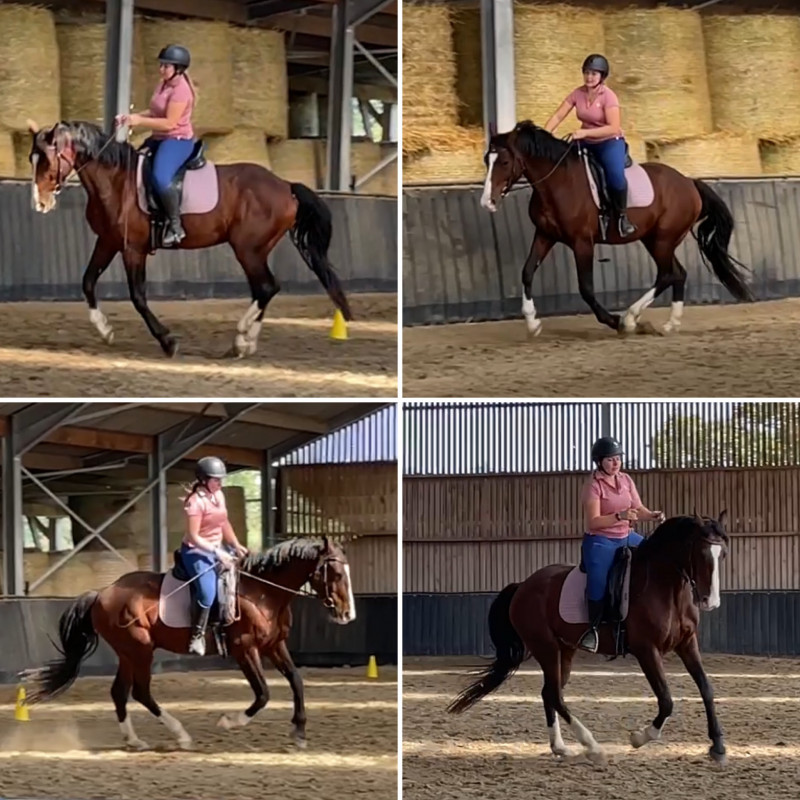 Post retour chez Caro, je demandais les départs au galop du pas et du travers pour l'aider à l'avoir souple, engagé sous lui, et en essayant de garder la mise en main dans la transition. Comme parfois c'est difficile, lorsqu'il ne "fait pas" il cherche des solutions soit il charge soit il s'enferme. Valider le fait qu'il force la main en me faisant "sortir de mon code de mise en main" n'est pas sain non plus (comme l'enfermement). Le soucis, qui avait été vu au stage avec Stéphanie, c'est que comme je fais les choses souvent à moitié il a bien saisi qu'il peut me faire bouger la main à sa guise, d'où mes soucis dans la mise en main : impossible de fixer ma rêne externe car il me la fait bouger où il veut. Je ne sais pas si je m'exprime bien? Là il réagit par moment d'une façon à ce code, il essaye, il se """punit"" (je n'aime pas le terme) par moment car il essaye de bouger ma main or maintenant j'arrive mieux à la fixer. Mais le code est connu depuis des mois, on lui a expliqué gentiment, à l'arrêt, à pied... il sait où est la solution confortable, à force de répétition ça s'améliore je trouve. Reste la problématique de l'équilibre sur les épaules que je dois absolument corriger avec ma posture.