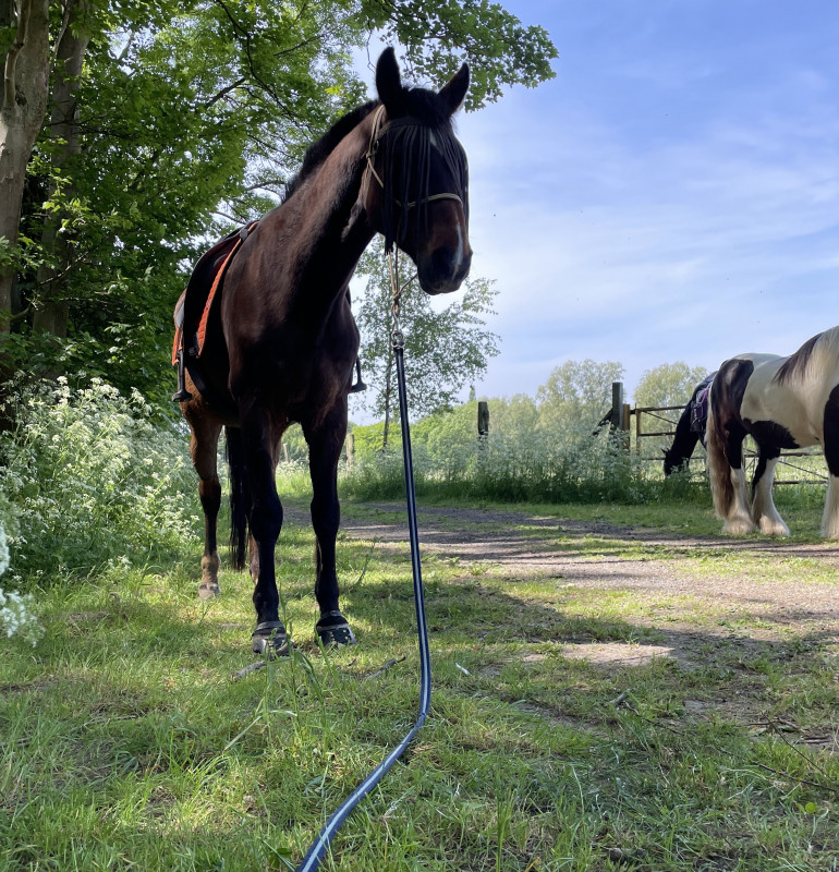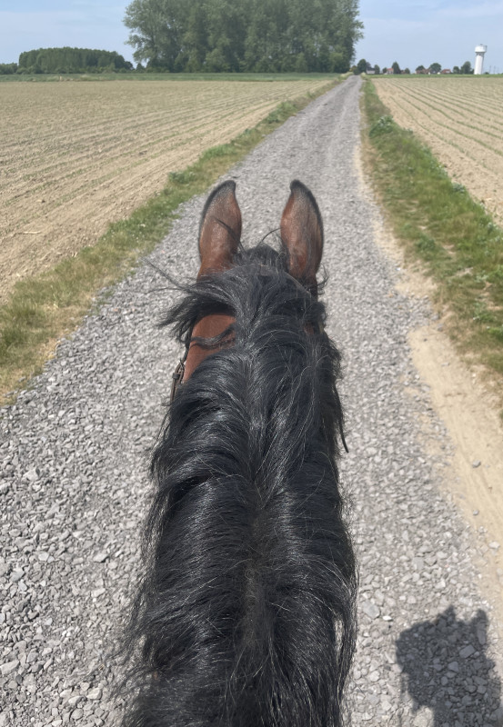 On était hyper chargées, je réalise que j'ai des sacoches qui trainent... Hop sur Daim, hop 6l direct, il s'en branle (qu'il est parfait). Une copine le prend, je prends Papy et on est accompagnée par 2 copines dont une avec un jeune pas débourré donc tout au pas. 15km en tout !