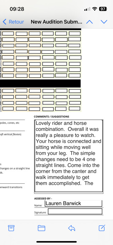 Hier, pas de boiterie mais je sens le pied encore un peu chaud. Du coup j'ai monté (à fin juste nique quoi...), pas d'asymétrie au trot selon le capteur il est à un 8,2 après un peu d'hésitation au début. J'ai fait quasi que du pas en bossant comme on avait fait avec la nana en R+ : beaucoup beaucoup féliciter, par contre du coup il anticipait à fond je devais faire très attention à mes aides. Du 2 pistes, du reculer, de l'activité dans la mise en main, de la tension du dos dans l'extension au pas. Vrai vrai mieux. A voir si j'y arrive sur des choses plus compliquées...