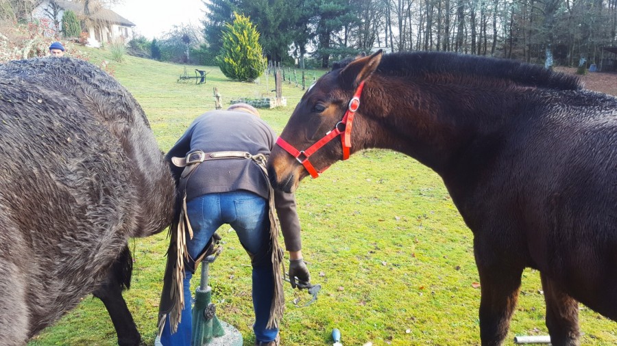 Cet hiver aura été calme et à la fois riche en apprentissages. Le temps d'apprendre à nous connaître et à nous faire confiance. Nous avons commençais le "travail" a pieds. Elle a appris à marcher en main, céder à la pression, déplace ses hanches et sait reculer. La prise des quatres pieds est totalement acquise. Après une petite pause, nous commençons tout juste les petites sorties en extérieur. La séparation avec le copain n'est pas toujours facile, alors nous y allons étape par étape. Elle a également vu le maréchal la semaine dernière et l'ostéo le mois dernier. J'ai aussi récemment abandonné l'idée de lui laisser la coupe en brosse qui lui va si bien... Après deux recoupes, j'ai finalement capitulé face à la vitesse de pousse de ses crins ! Ahah