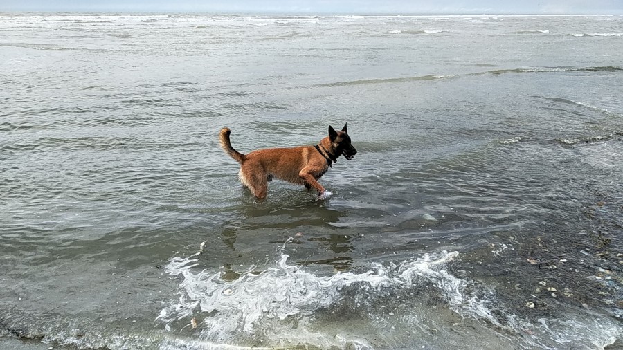 Dans les détails, la sortie à la plage s'est extrêmement bien passée ! Il a super bien joué avec ses frères, s'est roulé dans le sable, a pataugé dans l'eau. Quelques irritations sur le ventre à cause du sable mais c'est parti assez rapidement avec une bonne douche et de la crème.