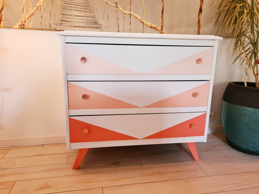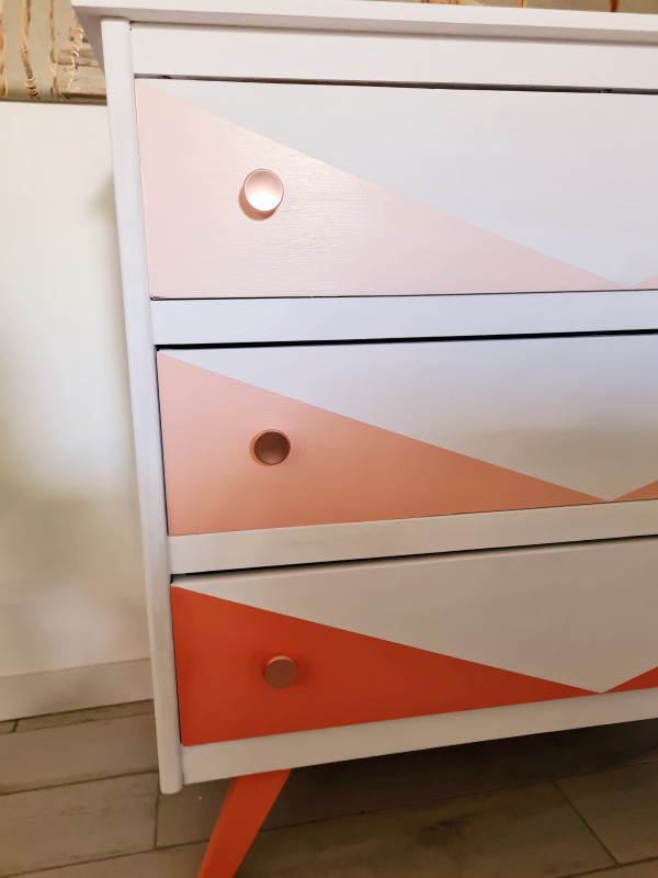 Tiens j'ai terminé de refaire entièrement la commode pour la chambre de la demoiselle hier ! J'ai trouvé un lit avec des pieds assortis, je les peindrai de la même couleur. Les couleurs ressortent pas bien sur les photos mais le rose corail est très lumineux et je suis assez contente d'avoir choisi du cuivre rose pour les poignées !