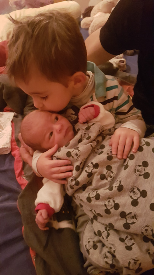 Mathias est totalement fan de sa soeur. Il veut tout le temps lui faire des bisous et la porter. Il veut lui donner à manger, il lui donne ses jouets, il adore regarder quand on la change... Bref ça nous fait fondre quand on les vois tous les deux.