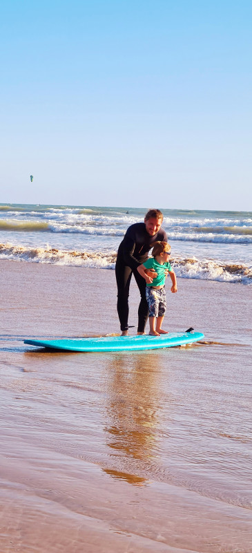 On a quand même pris le temps d'aller surfer mardi soir, Tao essaye même la planche de son père