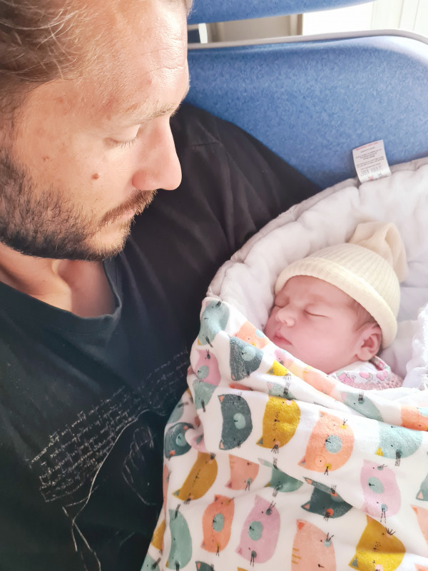 Comme pour son frère, elle est en pleine forme donc elle ne nous a pas quitté une seconde. Elle est en peau a peau avec moi pendant 2h, les yeux ouverts, elle est ultra calme et elle atterrit vraiment en douceur, elle tête super. Guillaume trépigne a côté ahah c'est vraiment un gaga de bébés, il est trop trop fan
