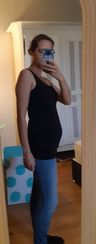 En vrai comme je porte tjs des hauts larges (et sinon je mets un gilet) ça passe encore très facilement inaperçu. Tant que je ne marche pas, parce que la vieille dégaine de femme enceinte boiteuse ne trompe personne !