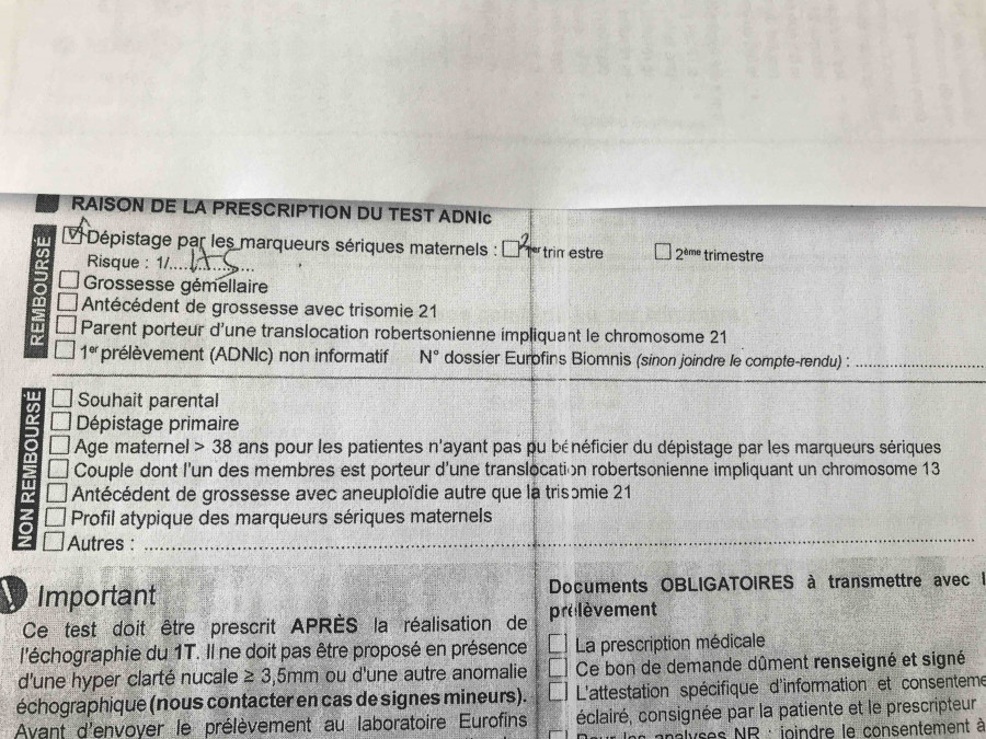 Et en effet c'est du 99% mais c'est déjà pas mal surtout si à côté les données de l'écho sont rassurantes (clarté nucale etc). Vu le prix je pense que s'ils le remboursent aujourd'hui donc tous les cas avec risque supérieur à 1/1000 c'est que cela s'est avéré plutôt fiable.