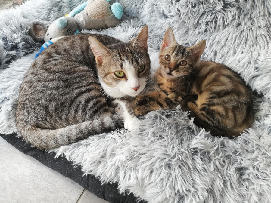 Je voulais vous partager ma petite photo bonheur qui n'est pas en rapport avec bébé mais avec mes petits chats. Minus sauvée à 10 jours, nourrie au biberon, gros retard de croissance et sa vie en jeu... 3 mois et elle est enfin "sortie d'affaire".