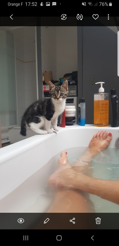 malwene je compatis pour le bain, jai la même a la maison, ça la passionne et elle boit dedans. Bon ce qui est moins drôle cest quelle est tombée dedans il y a 2 mois (quand l'eau coulait) et depuis jai peur quelle recommence quand je suis dedans^^ la elle était petite sur la photo mais depuis cest systématique
