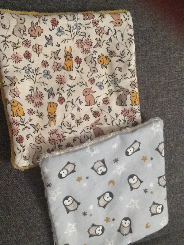 Un de mes tissus a des " poils longs " d'un côté. Je trouve ça super pratique pour essuyer les selles, les poils attrapent bien sur la peau. Je les ai cousues main pendant ma grossesse, j'en ai fait un peu plus d'une quarantaine et je tourne bien avec au rythme de mes couches lavables. Et je les trouve toujours aussi choupi