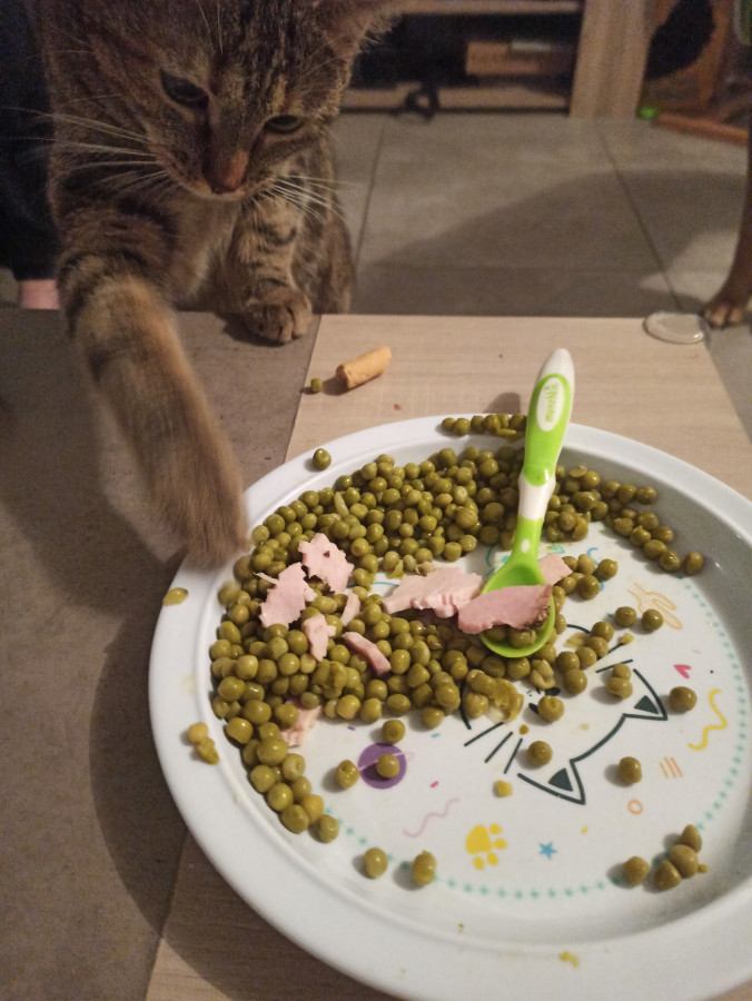 Direct live de l'assiette de Simon (qu'il ne veut plus, pas fan des petits pois).