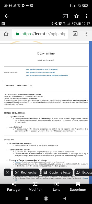 Il existe un autre médicament, avec la doxylamine mais autre chose en plus. Le SF de l'écho m'en avait parlé. Je n'ai plus le nom en tête. Et si ce ne passe pas : médecin pour tenter un autre traitement.