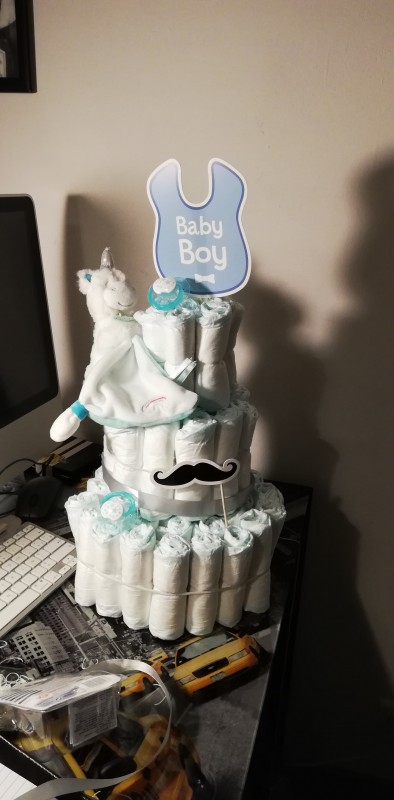 Le gâteau de couches pour la baby shower de ma meilleure amie commence à prendre forme. Il ne me reste que les espèces de deco/ruban à mettre autour.