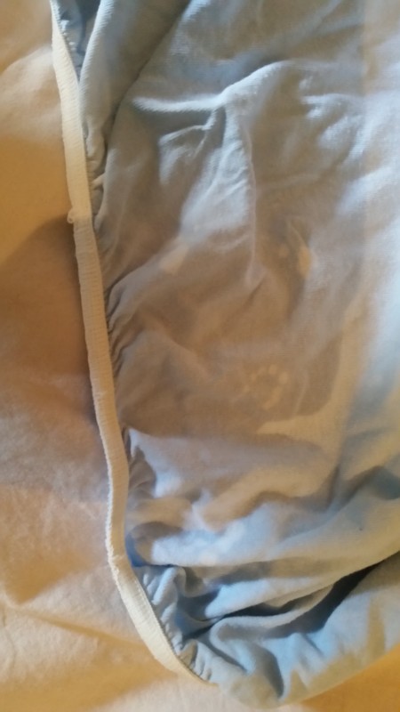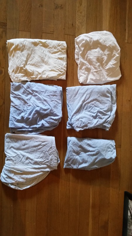 Voilà les photos des draps: donc j'en ai 6: 1 blanc, 1 jaune pâle, 4 bleus. Il y a un bleu qui a du rencontrer de la javel, mais les taches sont sur le bord au niveau de l'élastique du coup ça ne se voit pas dans le lit (j'avais jamais capté lol) et 1 alèse. J'ai vérifié pas de trou à priori et les élastiques sont en bon état: