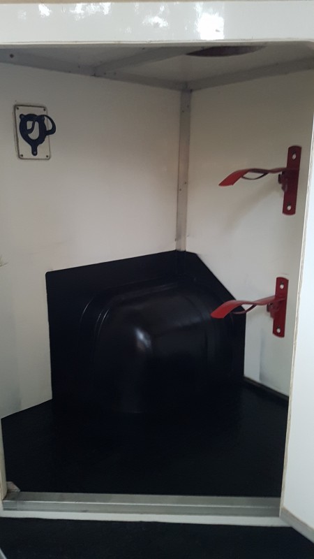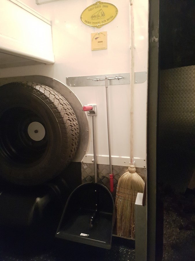 Partie "devant du cheval" : l'avant des chevaux est aménagé de façon à pouvoir mettre un petit seau pour les chevaux. J'aimerais remplacer le trou actuel par une mangeoire, mais compliqué d.en trouver aux mesures voulues donc je vais voir si il n'y a pas la possibilité de bricoler quelque chose. Autour, je pense couvrir le contreplaqué actuel par de l'acier grain de riz, idem sur la partie au-dessus de la sellerie.