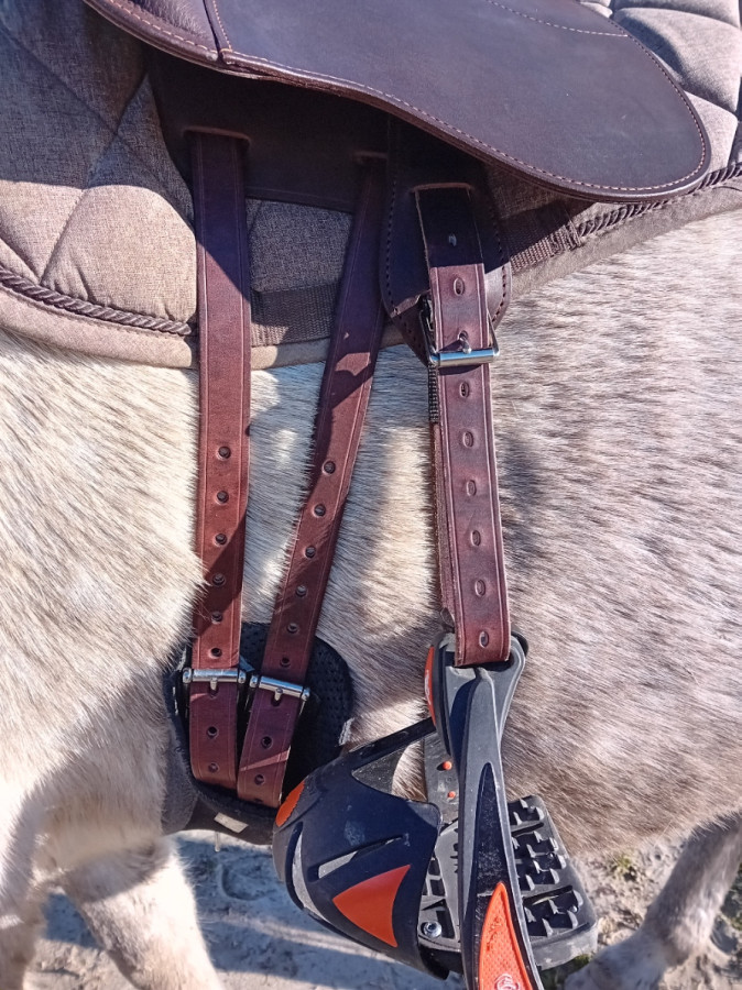 Alors la sangle que je lui ai mise est du coup un prêt, et oui, elle a bien des passants, ou plutôt je dirais un "fourreau" dans lequel les contre sanglons sont passés. Là je les avais laissés ainsi car je savais que j'allais ressangler