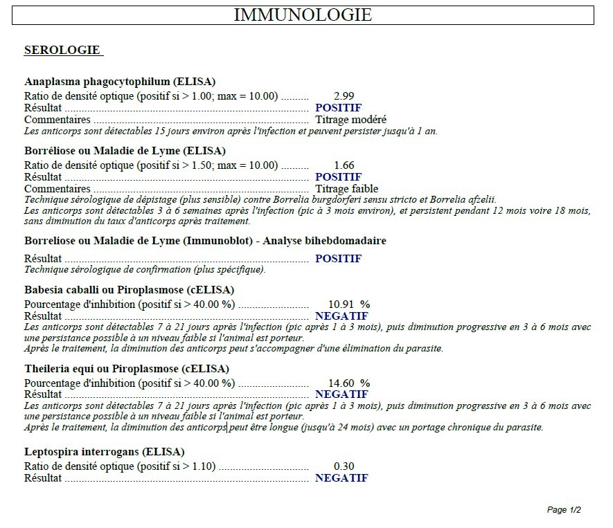 cymoril il est positif à Lyme, et peut-être à l'erlichiose ( si c'est bien ce que désigne l'anaplasmose ).