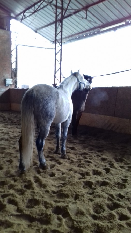 Je rencontre ensuite les propriétaires de V., la petite jument qui sera la coloc de Beauty ! Nous nous mettons d'accord pour les lâcher un peu dans le petit manège.