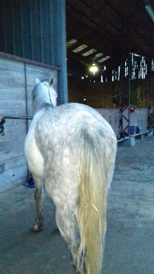 D'humeur suspicieuse, je l'attrape et l'emmène à l'écurie. Je lui fais donc un pansage un peu inutile + ses soins des pieds, elle est particulièrement statique, je ne l'avais jamais eu aussi calme à l'attache que depuis le jour de son essai. Je lui fais ses soins des pieds tranquillou.