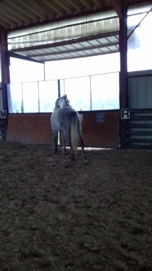 Après quelques minutes finis par la perdre en passant près de la porte, elle étudie un long moment ce qui se passe dehors. J'attends sagement un peu plus loin, elle finit par me rejoindre. Je lui remet sa longe et je lui fais faire 2-3 départs-arrêts. Beauty est maintenant parfaitement détendue, je sors du manège et l'emmène dans la carrière de dressage faire un tour à chaque main.