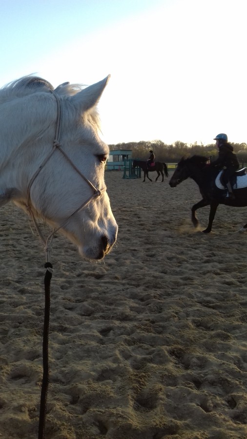 Il y a eu une petite pause pendant laquelle un cours du club alors partie en balade est venue dans la carrière pour galoper. Beauty est restée bien sage à l'arrêt au milieu Elle m'a épaté !