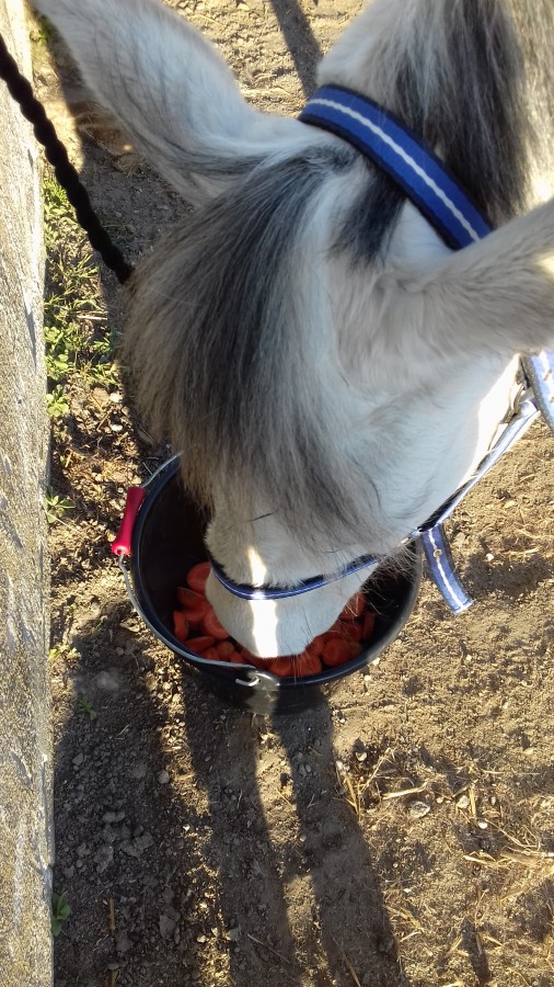 Je la panse pendant qu'elle dévore un bon kilo de carotte fraîchement récupéré Je lui ai fait les crins, la queue, les pieds ... Une paix royale ! D'autant plus que je l'ai attaché en face de la petite carrière, là ou je ne l'avais jamais attachée avant.