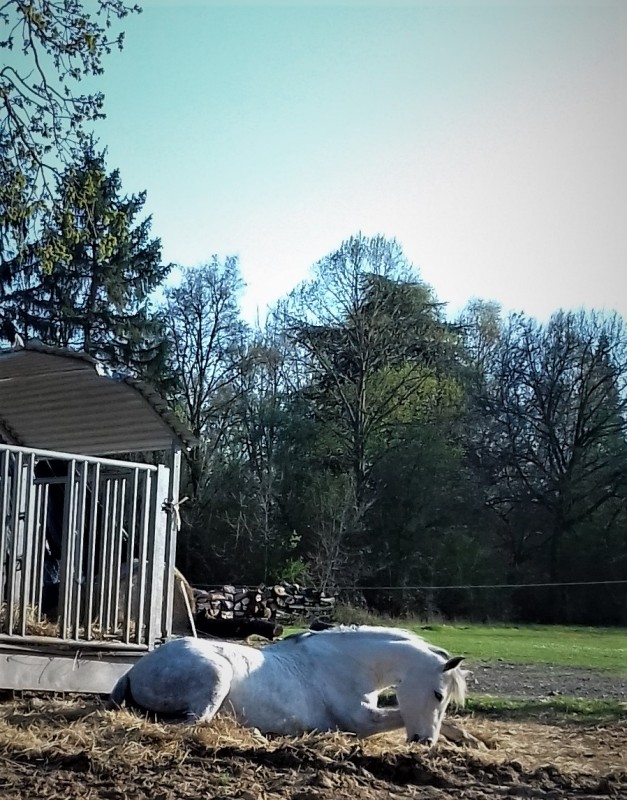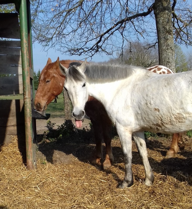 Azur nous a suivi au premier départ en mode "Wait, qu'est ce qui se passe ???" puis quand elle a compris qu'il n'y avait pas de danger elle est retourné au foin. Quand je suis partie, Beauty a eu un comportement que j'ai interprêté comme une invitation au jeu à l'attention d'Azur, qui lui a mis un vent phénoménal. J'en viens donc à la conclusion :
