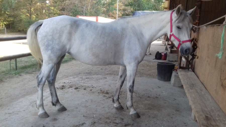 Je ne fais donc pas trop de manière à Belette. Un licol, un bonbon, au pansage, les pieds, la selle ... Elle a quelques vilaines tâches jaunes un peu partout !