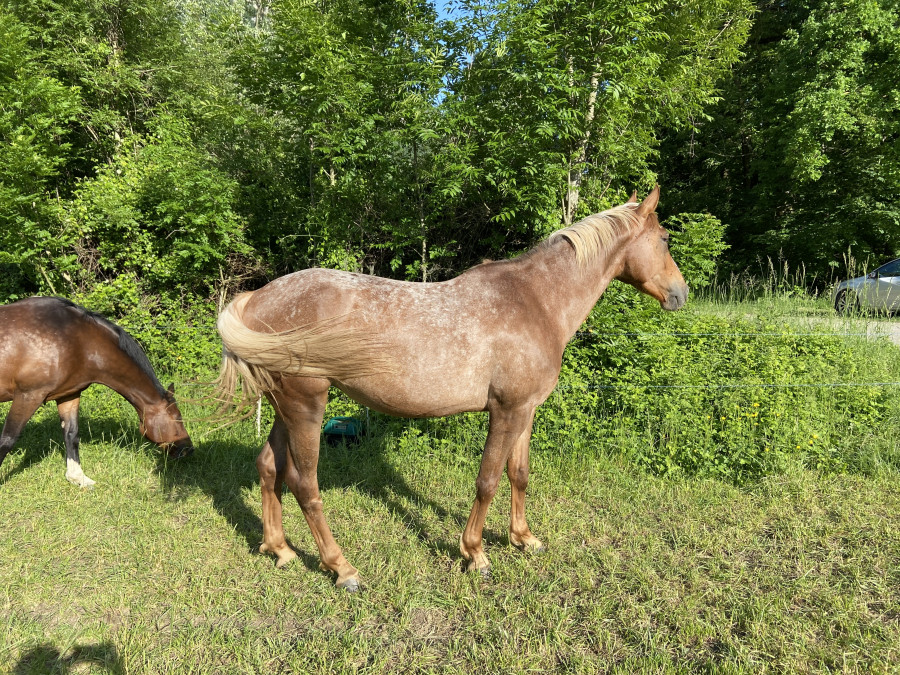 Après quelques visites, je tombe sur l'annonce d'une jeune jument de 2016, elle ne paye pas trop de mine mais elle est à 10km de chez moi. RDV est pris, le jour même je vais la voir .. Et j'ai flashé, elle a les fesses 5cm plus hautes que le garrot, est timide, discrète, mais c'est elle ...