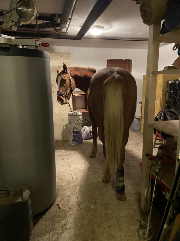 Elle me fait toujours autant rire, je la retrouve parfois dans ma sellerie, dès que j'ai le dos tourné elle s'y engouffre en zigzaguant et après elle me regarde, du genre, "j'ai rien fait maman ". Les sacs de grains sont vides et servent de poubelle
