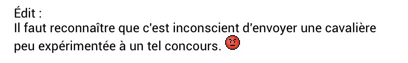 Bref, je trouve super dur celles qui disent : elle ne semble pas impactée par l'attitude du poney... ben non elle doit avoir 8 ans, papa et maman lui ont acheté son poney, l'ont emmené au concours, payés la coach, le matériel, l'encouragent certainement donc en fait... elle fait son concours sans trop se poser de questions.