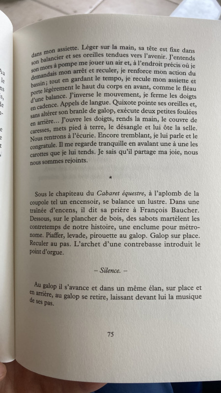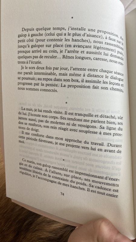(A ce stade, le cheval est mis aux appuyers, pirouettes et galop sur place en descente d’aide).