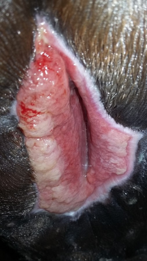 sur cette photo c'est le lendemain de la 1ere application de miel ! bon, après un bon nettoyage, c'était saignant hein... mais on voit bien à quel point ça sèche la plaie..