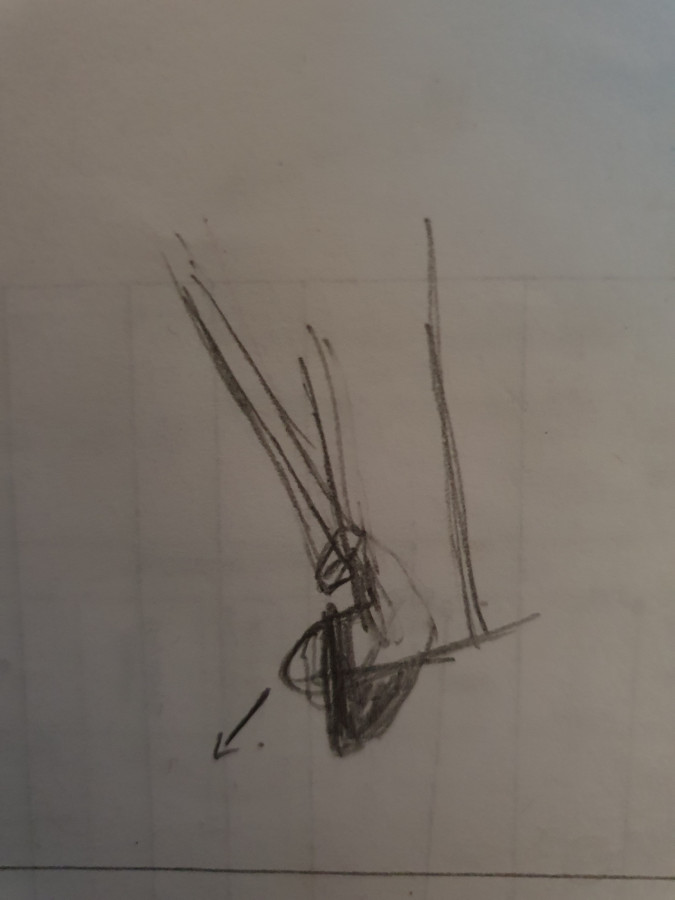 Voilà donc mon dessin, le trait en bas c'est le sol pour l'orientation, la flèche c'est le sens de poussée de la jambe et du pied qui pourrait amener à passer le tibia dans la branche.