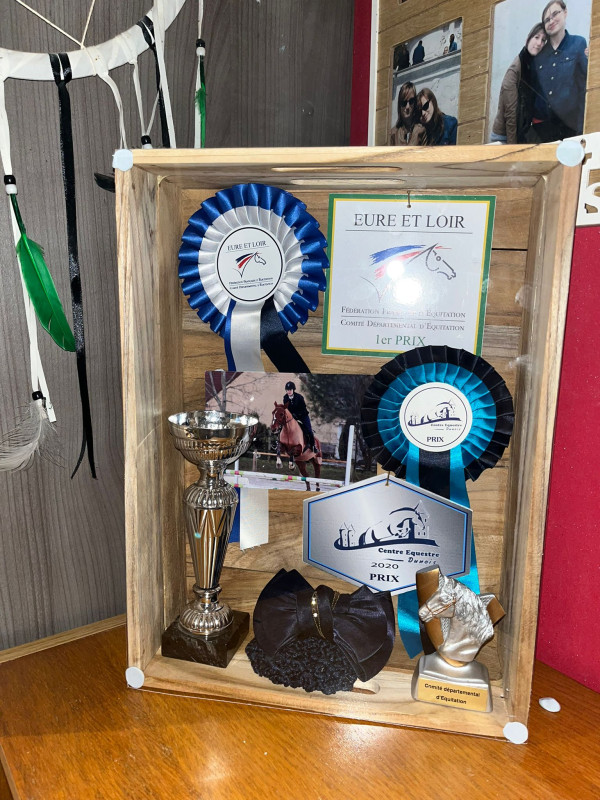 j'ai fais quelques podium (souvent 3eme place) mais pour la seule 1ere place que j'ai eu j'ai eu l'envie de mettre en valeur les plaques, les flots et les coupes dans un cadre ... malheureusement la largeur d'une coupe posé problème avec les cadres "profonds" trouvable dans le commerce j'ai décidé de le fabriquer moi même (bon il reste 2-3 petites choses a modifier pour l'esthétique mais voici le résultat