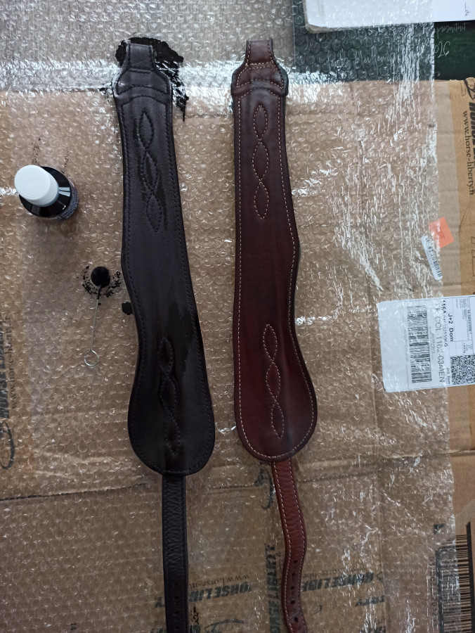 Je n'ai jamais essayé la version en marron mais je vous joint ci dessus une photo du produit miracle, de ma selle avant après et même d'un frontal à l'origine marron que j'ai pu assortir avec un filet sur lequel il manquait des pièces !