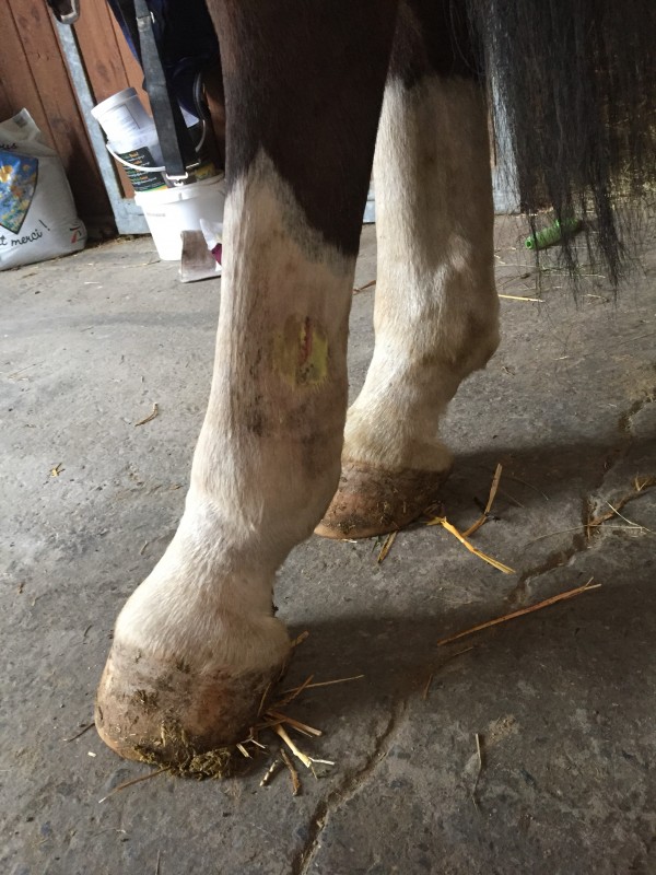 Mon cheval s'est sans doute fait shooter au pré mardi passé. Il avait un petit plaie et bien gonflé. Je l'ai bien douché et appliqué de la téramycine sous bandage et arnicagel (pas sur la plaie ).