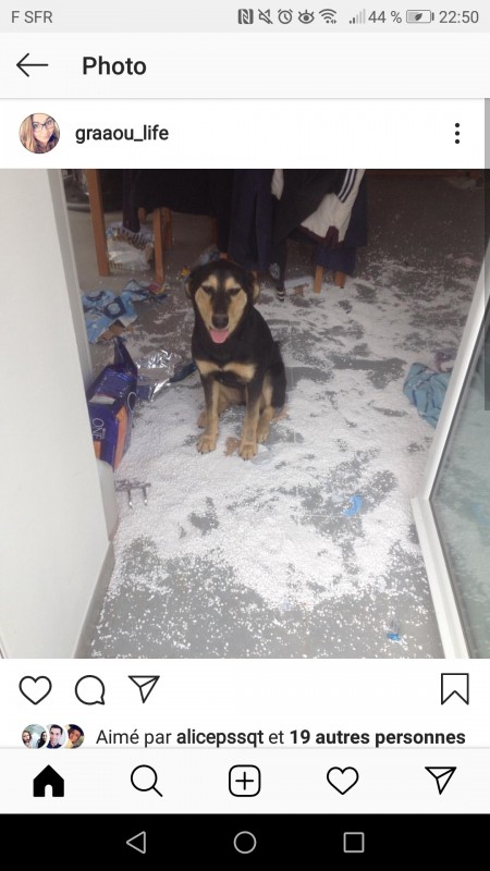 Et bien Nef arborait un sourire de " vampire" à la place de paille , gisait des billets de 50 euros...Cet enf**** avait bouffé plus de 500 euros et les petits bouts noir qui gisaient à terre , c'était ce qui restait de mon portefeuille....