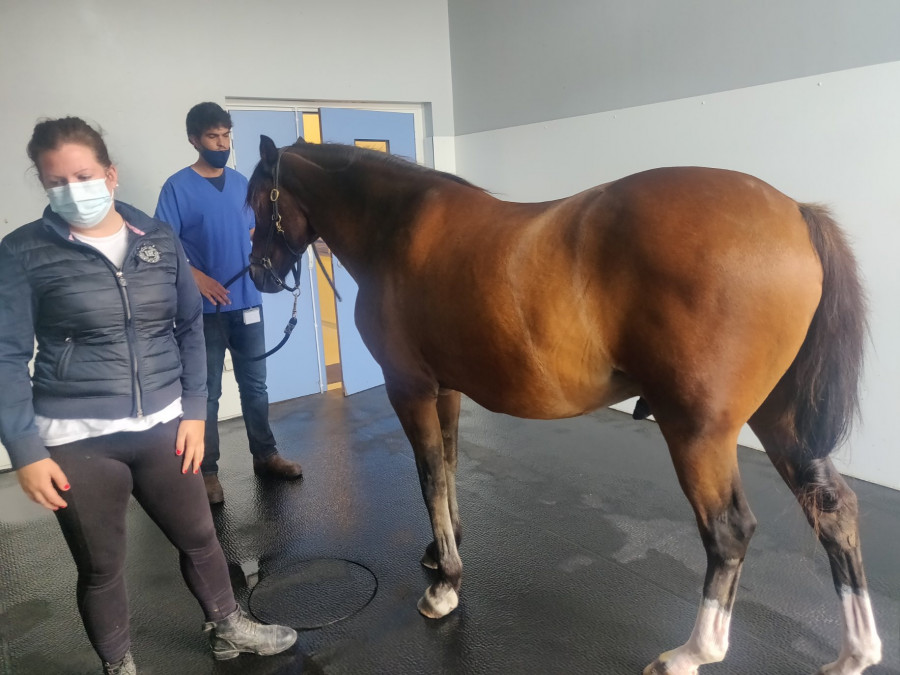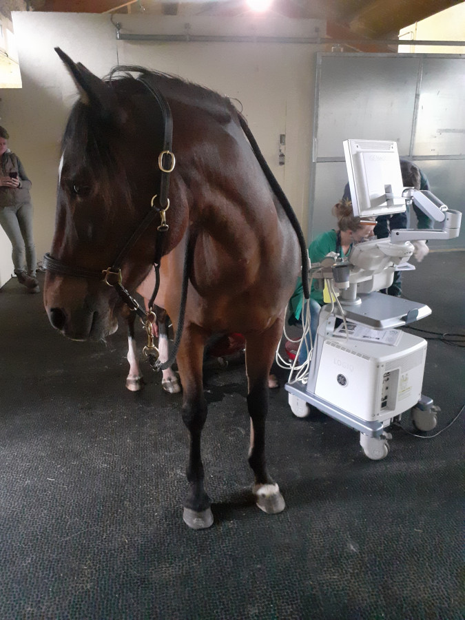 Palpation (Avec un petit rodéo de Quazac ), échographie, test de la planche, trot en ligne droite, test de flexion, longe sur sol dur, longe sur sol mou, radiographie, injection d'un produit dans la gaine tendineuse, re-radiographie, re-échographie... Un poney EXEMPLAIRE de patience !