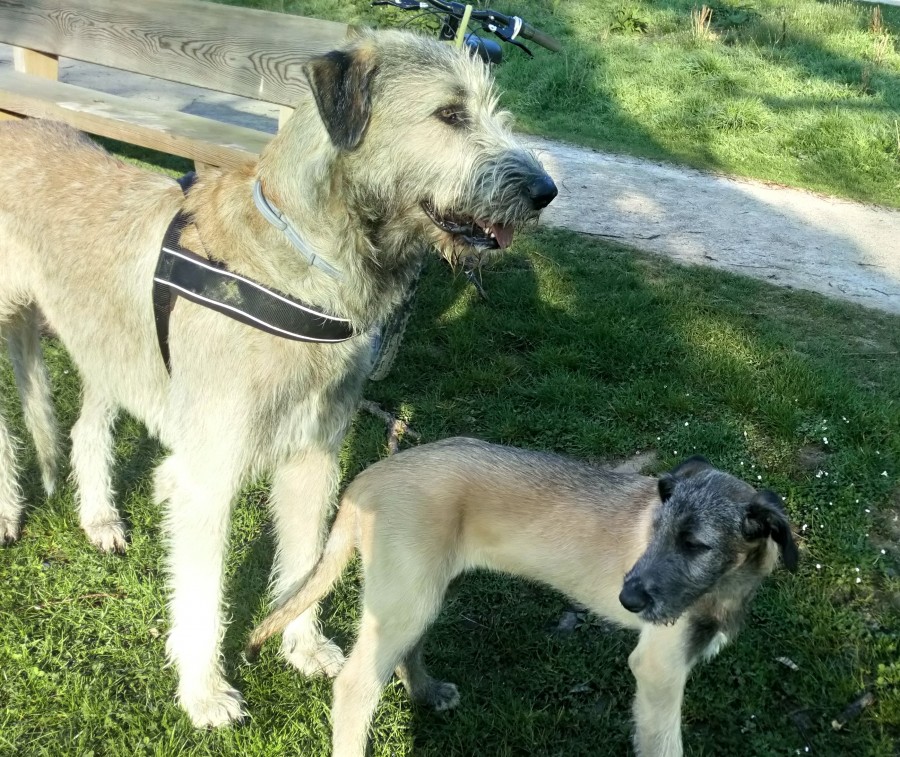 C'était un chiot extrememnt nerveux , le seul truc qui le calmait c'était le vélo, malgré les avis de la communauté " irish wolf" je prenais le chien tranquille en roulant comme une tortue et en faisant bcp de pause.