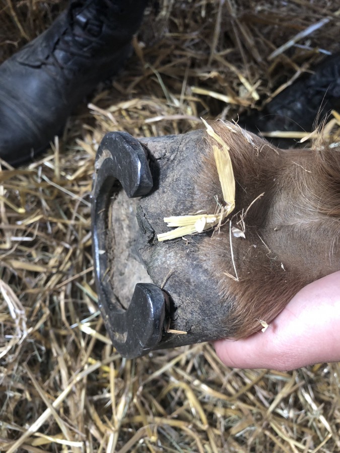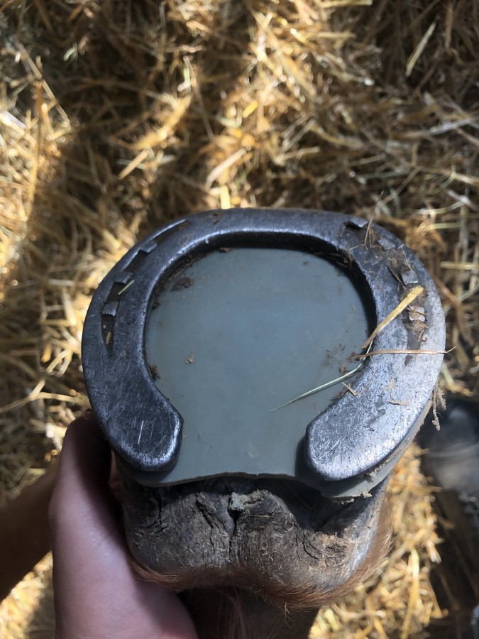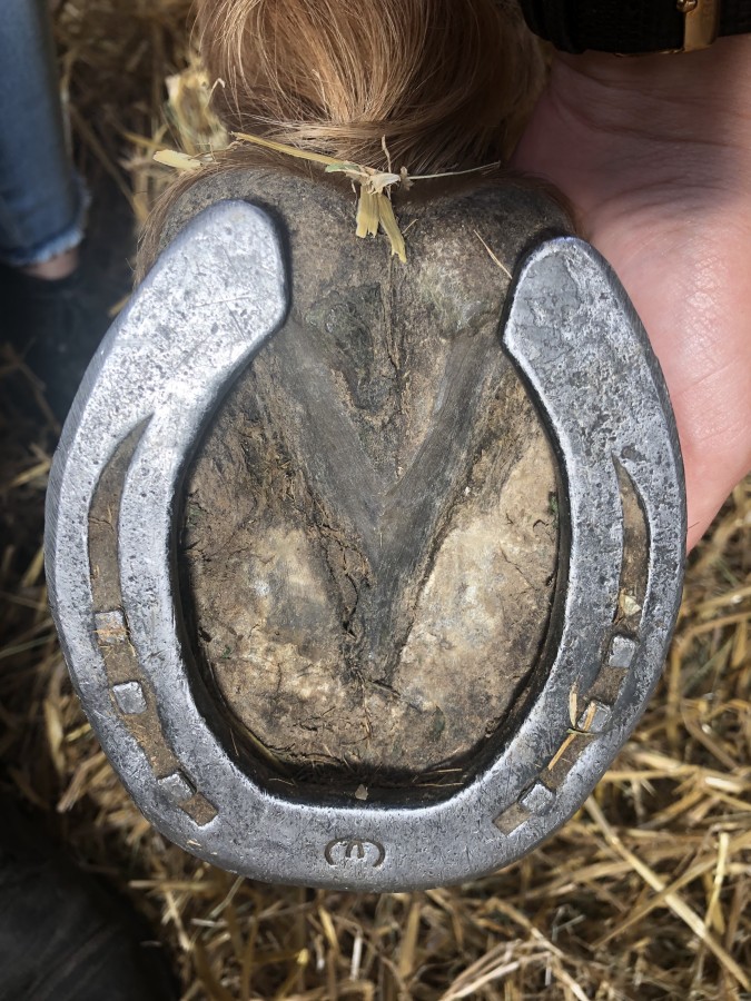 L'adaptation pieds nus a été impossible et même les boots ne suffisaient pas. Elle est ferrée des antérieurs. Avec des fers classiques, pas de plaques, pas de silicone. Jamais. J'ai un excellent maréchal. Et comme elle est très sur l'œil et de nature peureuse, il la ferre à froid.