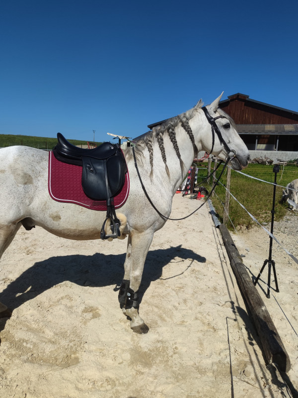 Clovis, beh c'était pas notre jour... Détente pas mal, puis y'a deux chevaux qui sont sortis de la carrière, il a essayé de paddocker sauf que nope hors de question. Après ça j'ai eu un mal fou à le récupérer, en plus on se faisait bouffer par les moustiques... Bon j'ai essayé de faire des assouplissements sur le cercle dans le style cercle de Saint André, bah... Nez dedans, hanches dehors ça allait, nez dehors hanches dedans à peu près (fallait que je le remette en avant régulièrement sinon il se mettait trop sur les hanches j'ai eu peur qu'il me sorte un truc bizarre entre le piaffer et le cabré à un moment), mais les deux autres "ateliers" oof, laisse tomber. Il est raide le machin. XD Après j'ai voulu travailler le galop mais plus pour ma positions, bon... Départs à faux quelle que soit la main, ça venait de moi, là, clairement, j'ai l'impression que c'est mon bassin qui le bloquait. On a quand même eu quelques départs corrects, a un moment il a voulu repasser au trot alors que moi non, je l'ai remis en avant, il a essayé de lancer les fesses mais ça marche pas, puis j'ai vu pire pour moins que ça donc si l'objectif c'était de me faire peur c'est raté.