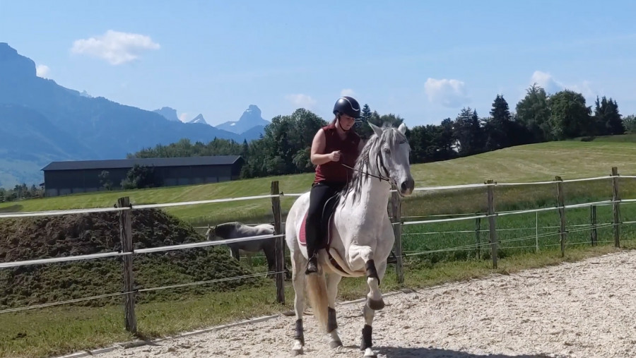 Pareil à main gauche, du trot assis, avec les pieds qui restent en place, yes. Bon à faux... On refait, en restant en ordre, et bingo, sur le bon pied. Pareil on avance, sur un grand cercle, on essaie de prendre du contact. Pas trop mal !