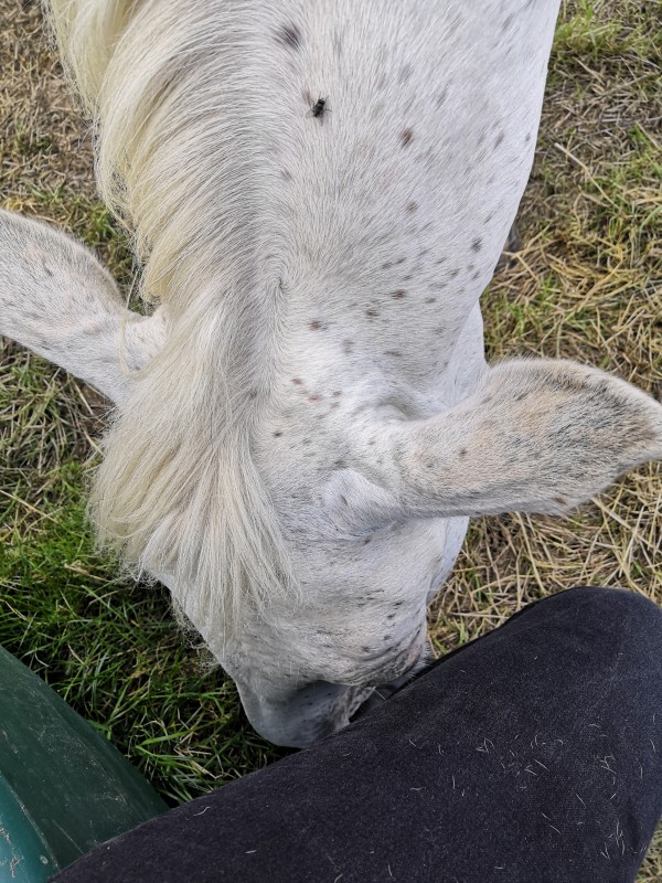 Maintenant, elle se laisse très bien attraper au pré. Dès qu'elle me voit elle se dirige vers moi de toute manière. Je lui passe le licol et carottes :) Des filles de l'écurie disent qu'elle va aussi à leur rencontre lorsqu'elles vont chercher leur cheval.