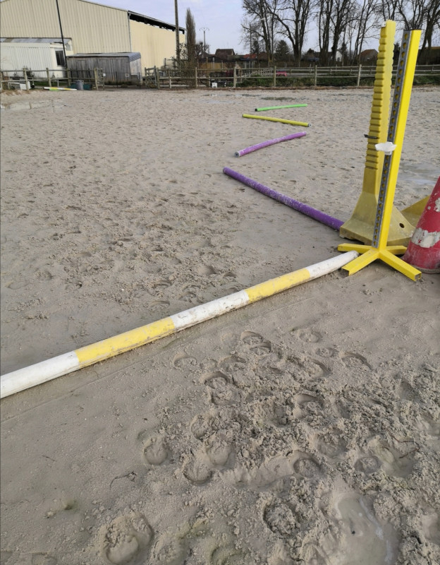 Donc je l'ai longé vite fait. Et je lui ai fait sauter un vertical de 60cm en longe. 3 fois aux deux mains, au trot. Une jument qui prend un petit galop derrière et j'arrive bien à la remettre au trot derrière. Une jument franche mais je comprends pourquoi j'ai du mal à encaisser ses sauts quand je suis dessus, elle s'arrondit vachement sur le saut et met de la marge !! Bon, au moins elle ne saute pas à plat et ne fait pas de barres lol.